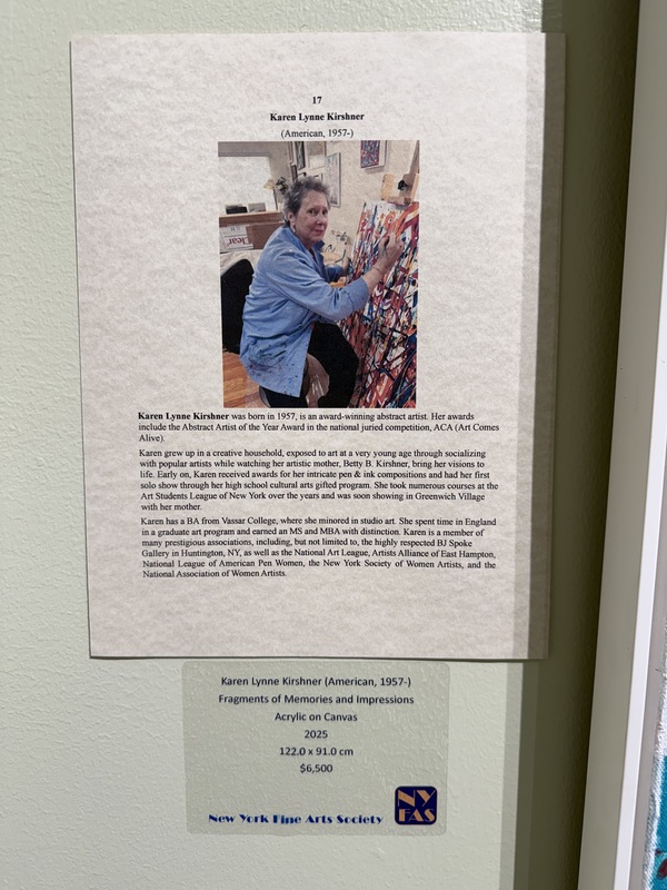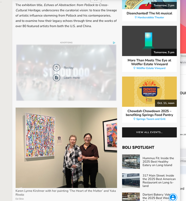 Karen Kirshner is one of the featured artists in the Long Island Now article about the Echoes of Abstraction exhibition of the NYSociety of Fine ArtsPublished online August 26, 2025Karen Kirshner and The Heart of he Matter! is on display at the Flowerfield Gallery, St. James, NY in this photo, with Yuka RIvollo, the co-owner of the gallery. The Exhibition continues in Shanghai, Oct. 1- Nov. 30, 2025.