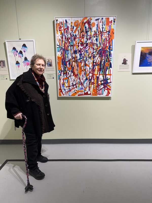 Karen Kirsner at the White Room Gallery perhaps, in 2018Kirshner with her painting, ©Rhapsody #4, 2018, currently owned by a collector in Rhinebeck, NY.
