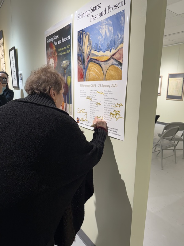 Artists, Chris Greene and Karen Kirshner are discussing their impressions at the exhibition2025Both Artists are in the Pigments of the Imagination exhibition, Dix Hills, NY, 2025.